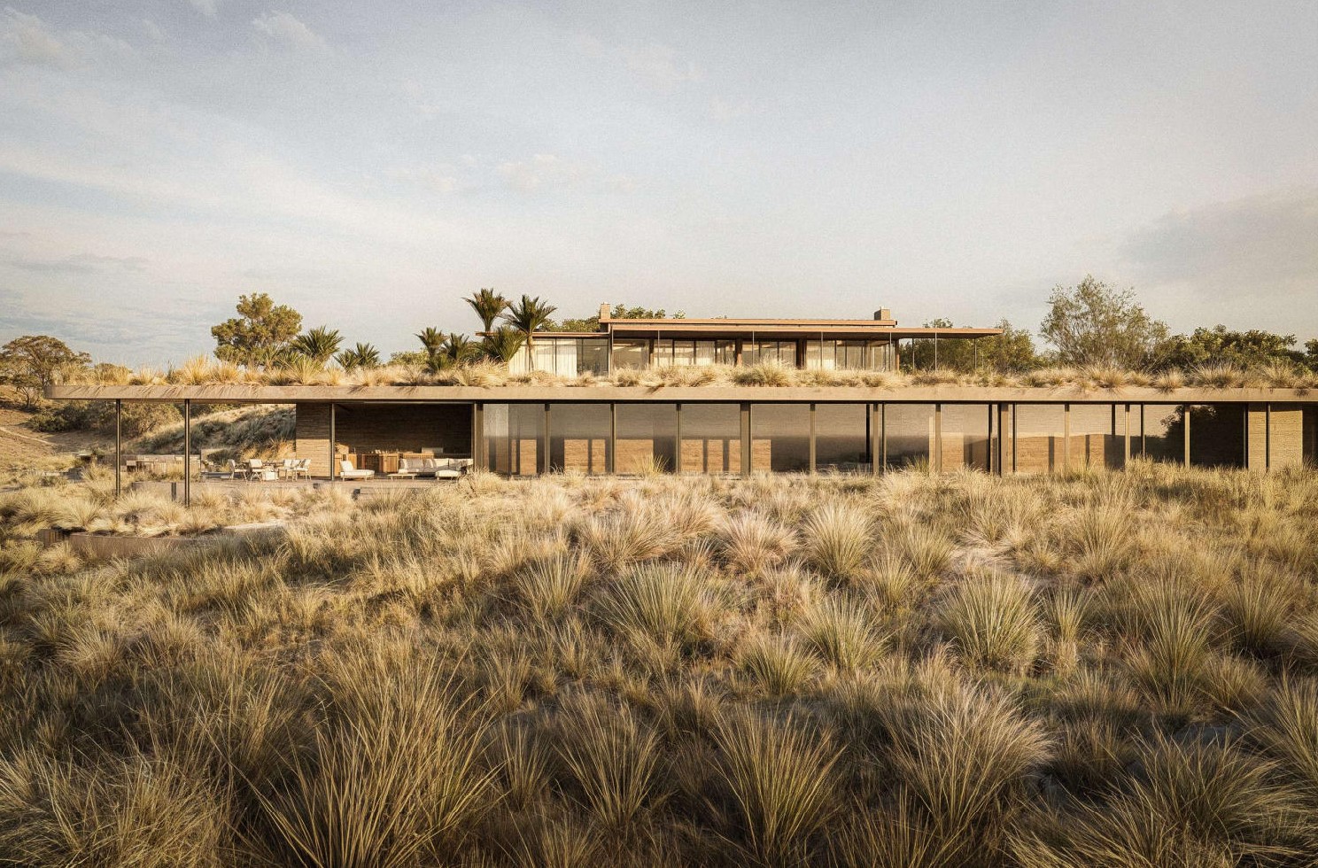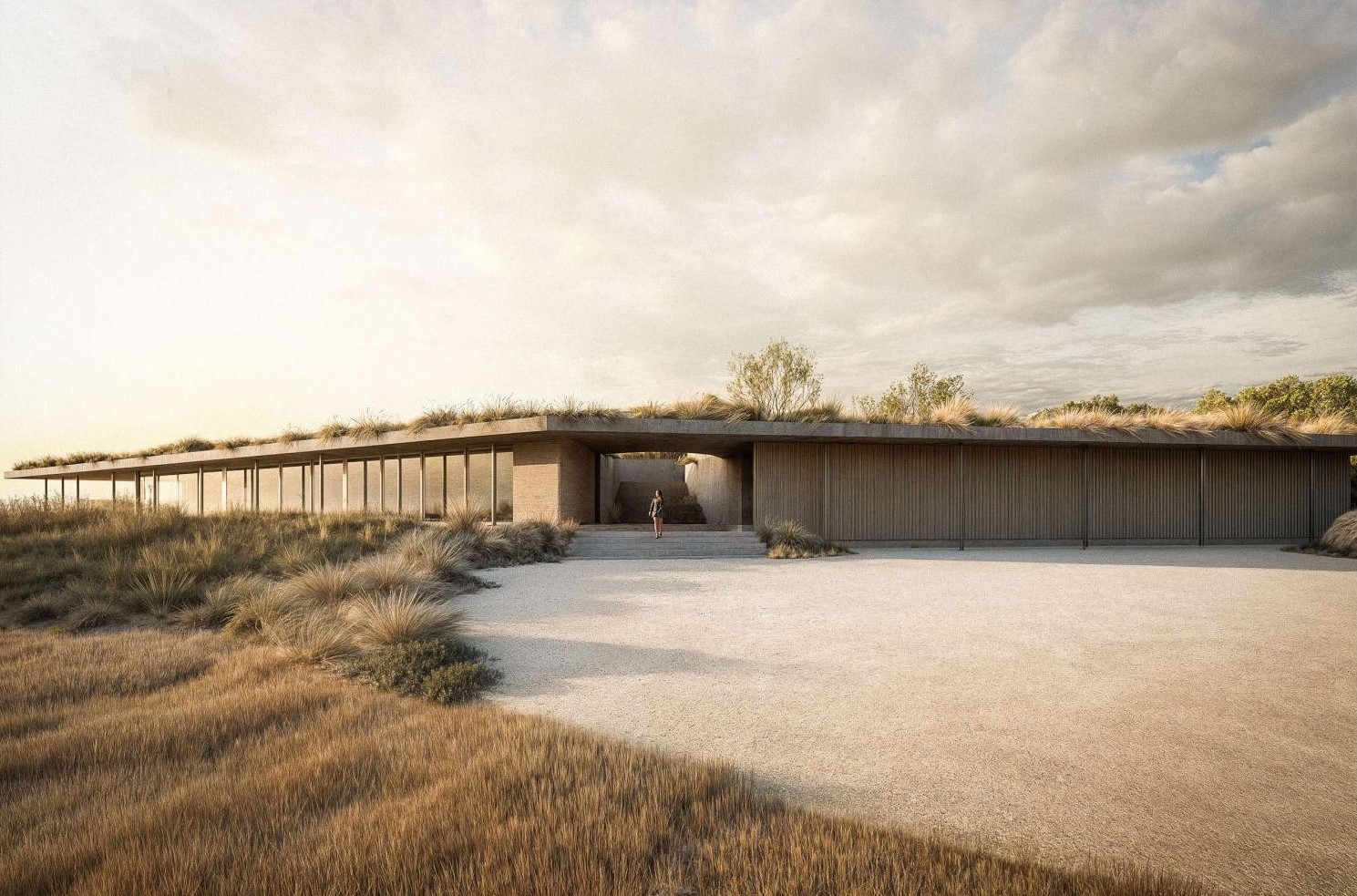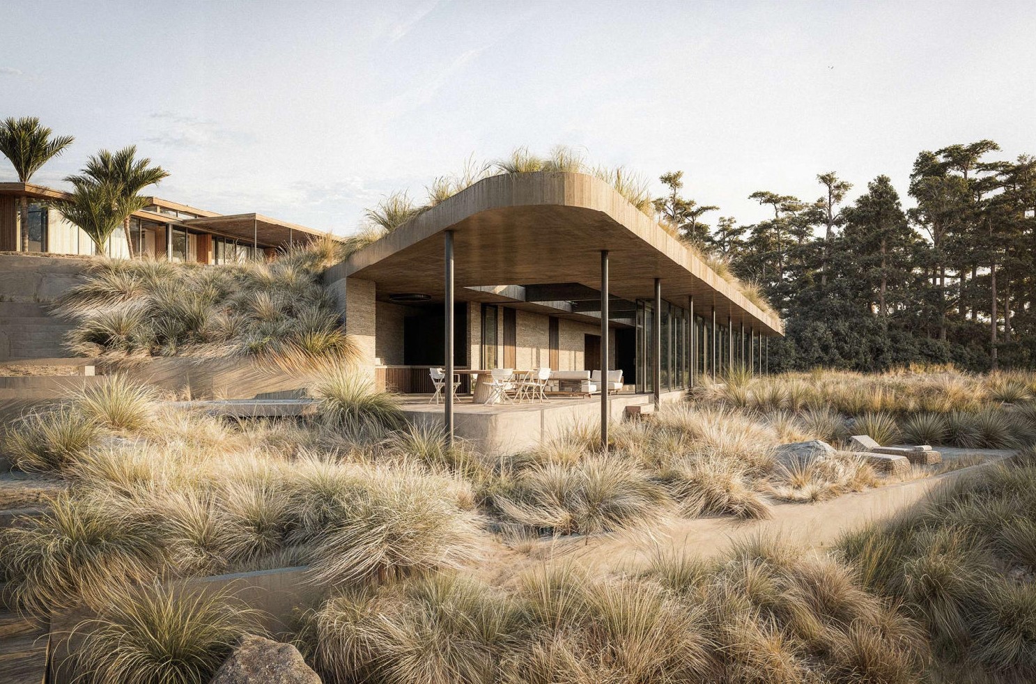 Designed to work in harmony with the existing house on site, the new structure is nestled into the terrain, with a low-slung green roof and sympathetic materials that mirror the natural surroundings. Glazing along the seaward façade brings in light and offers expansive views to the bay, while the building’s low profile and carefully landscaped transitions ensure it remains visually unobtrusive.